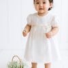 Our smock dress designed for young girls from Arthur Ave, crafted and lined with a soft cotton blend. Featuring timeless puffed short sleeves, this airy cotton dress showcases an elaborate smocked bodice, complete with a waist sash to adjust for growing bodies. The back is adorned with button fastenings in a matching white hue. For older girls, the dresses come with sash ties to be fastened into a bow at the back.