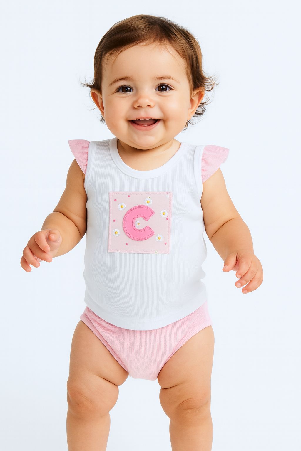 Each vest has a letter of the alphabet appliquéd on the front to represent little one’s first or last name.